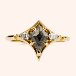 Introducing Cosmos, a timeless piece of jewellery design crafted in our Hatton Garden workshop. A mystical Kite Salt and Pepper Diamond is the centrepiece, surrounded by a pair of shimmering Pear cut diamonds and all set in luxurious gold. Stellar luxury that will glimmer through the ages.